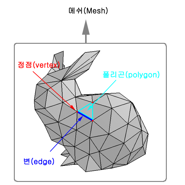 점(Vertex) -> 선(Edge) ->면(Polygon, Face) ->개체(Mesh)