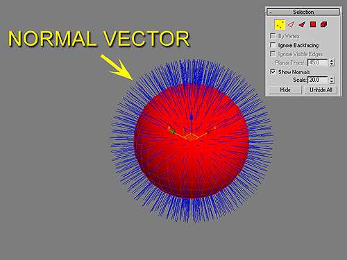 3DS MAX의 경우 물체표면을 이루는 다각형들의 노말(Normal)을 확인할 수 있는 기능이 있습니다. Edit Mesh나 Edit Poly에서 Face 모드나 Polygon 모드에 들어가시면 Show normal옵션이 있습니다. 이 옵션을 켜면 물체 표면의 노말들이 마치 털처럼 삐죽 솟은 상태로 보여집니다. 이 노말을 편집할 수도 있는데 Edit Normal 모디파이어를 사용하면 편집도 가능합니다. 결과는 물체표면의 음영이 바뀌는 것을 확인할 수 있습니다. 또한 노말 벡터는 물체표면에 수직입니다.