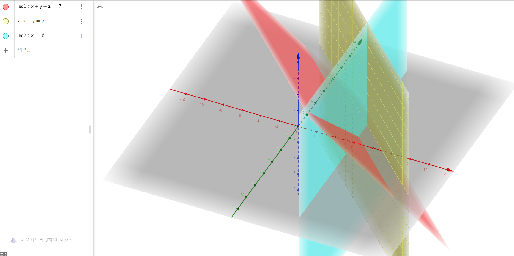 - 노란색 평면(x+y=9): xy평면상에서 전형적인 방정식 직선 형태를 보이는데, z좌표 값이 정의되지 않았기 때문에 xy평면상에서 보이는 직선이 그대로 z축 방향으로만 확장된 형태의 평면으로 나타나진다.