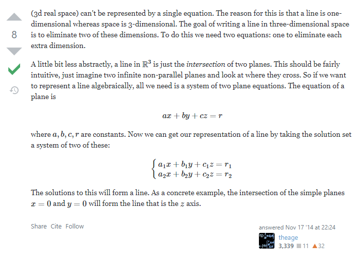 3D 공간에서 직선은 한 개의 방정식으로 표현될 수 없다. 이것의 이유는 공간은 3차원인데 반해 직선은 1차원이기 때문이다.(*평면은 2차원이고 직선은 1차원임.) 3차원 공간에서 선을 결정지으려면 두 차원을 날려버려야한다. 이것을 위해 우리는 두 방정식이 필요함: 각자의 추가 차원을 날리는 방정식들.